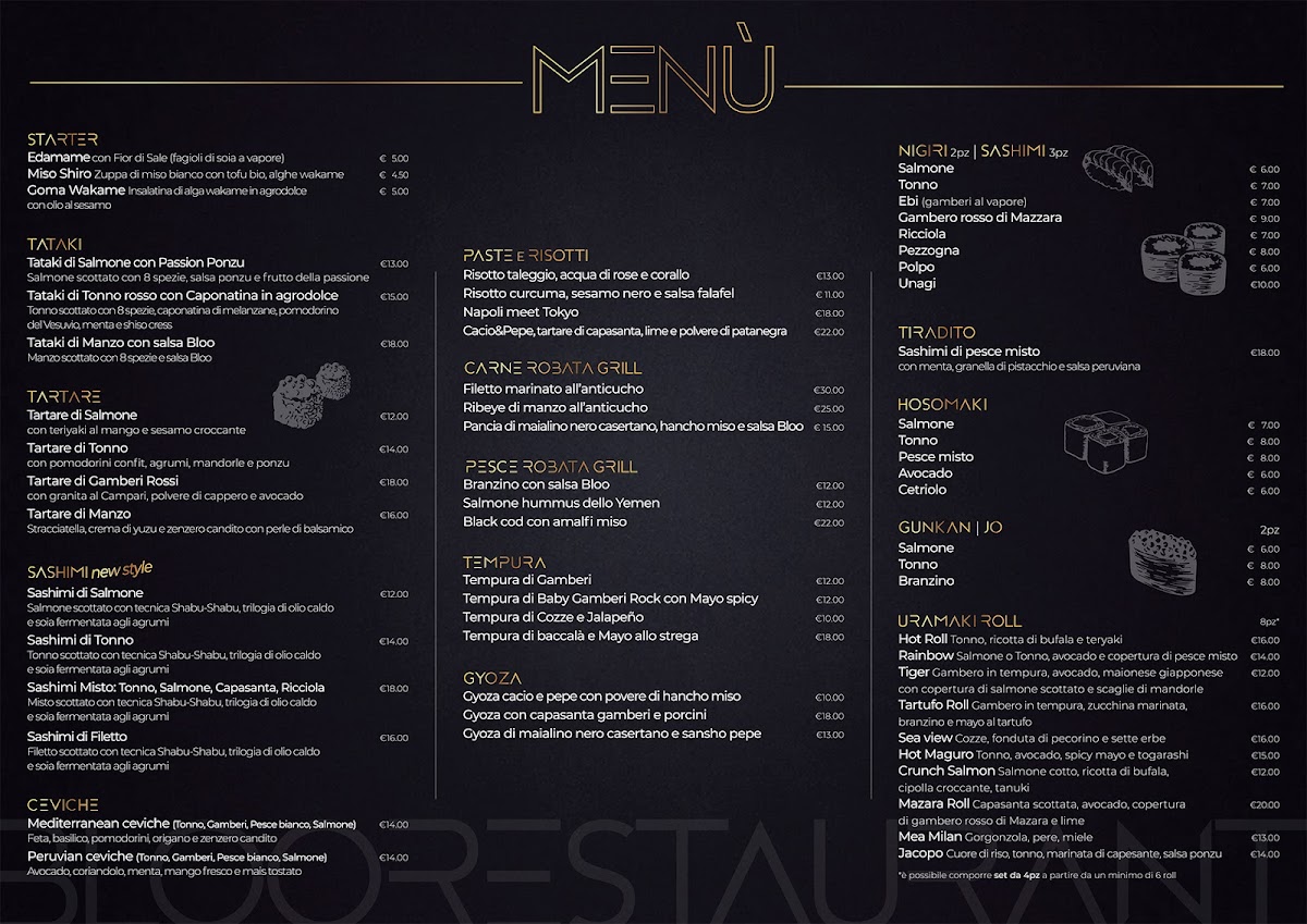 Bloo Restaurant is renowned for its high-quality dishes, where the fusion of flavors takes center stage. The menu showcases an impressive variety of dishes, particularly highlighting their delectable sushi. Customers like Eric Nicola Frison have described the locale as "bellissimo," emphasizing the aesthetic appeal and the exceptional quality of the food. Rita Marino echoes this sentiment, praising both the beautiful ambiance and the generous sushi servings that solidify Bloo's reputation.